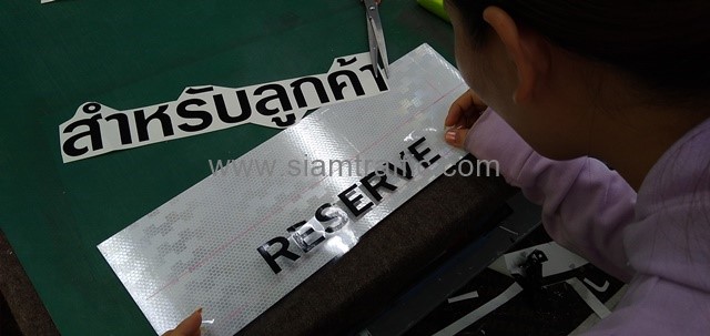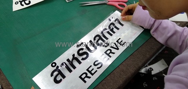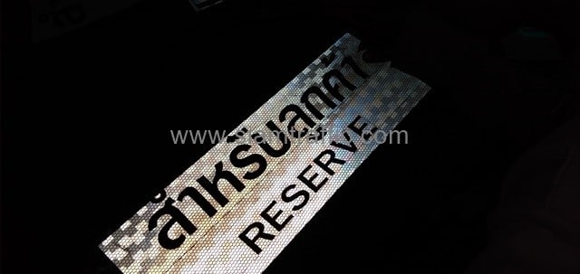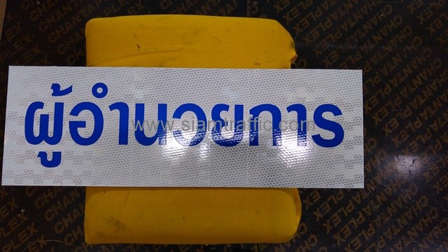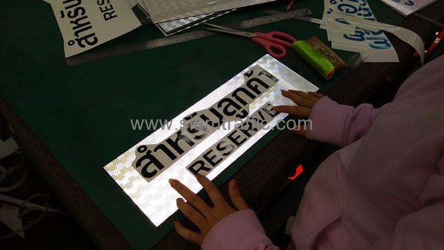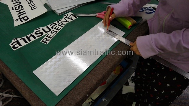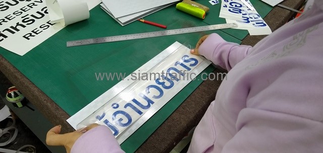 - แผ่นอลูมิเนียมหนา 2 มิลลิเมตร ติดสติกเกอร์สะท้อนแสง PEG