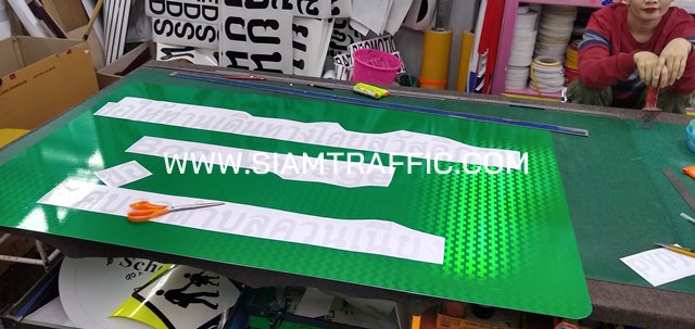 - พื้นป้ายสีเขียว อักษรสีขาว