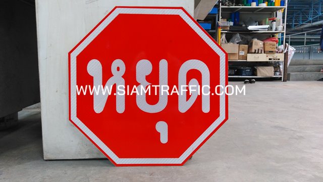 - ป้ายบังคับ บ.1 หรือป้ายหยุด ขนาด 60 x 60 ซม. จำนวน 3 แผ่น