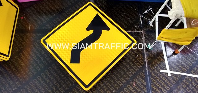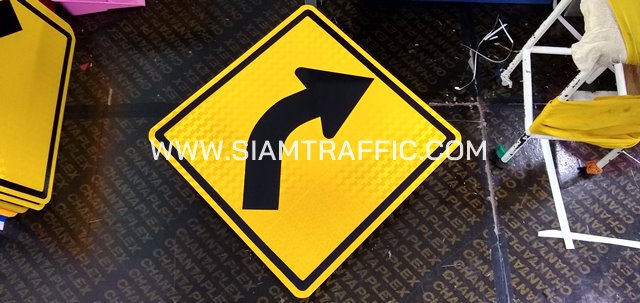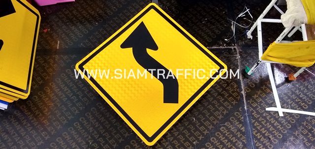 - ป้ายเตือน ต.2 หรือป้ายเตือนทางโค้งขวา ขนาด 60 x 60 ซม.