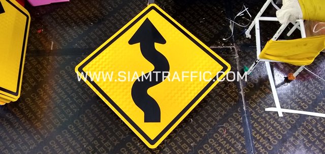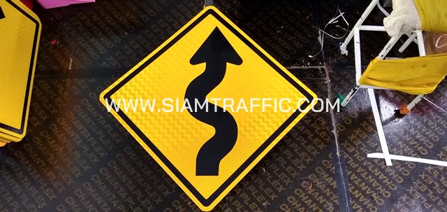 - ป้ายเตือน ต.10 หรือป้ายเตือนทางคดเคี้ยวเริ่มขวา ขนาด 60 x 60 ซม.