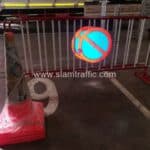 - ป้ายห้ามจอดตลอดแนว แบบกลม ขนาด 45 เซนติเมตร สำหรับติดหน้าแผงกั้นจราจร จำนวน 2 แผ่น